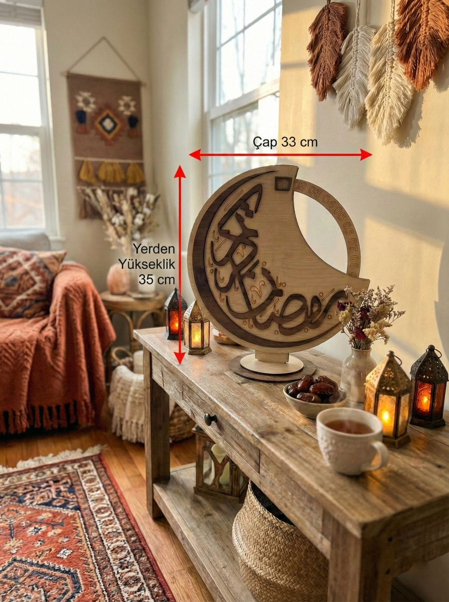 Özellikle çocuklar için oruç günlerini takip etmeyi eğlenceli hale getiren hareketli çark mekanizması sayesinde, her gün iftar heyecanını ailenizle birlikte yaşayabilirsiniz. Sıradan küçük süslerin aksine, 35 cm yüksekliğindeki gösterişli boyutuyla salonunuzun, konsolunuzun veya Ramazan köşenizin yıldız parçası olmaya aday.