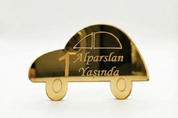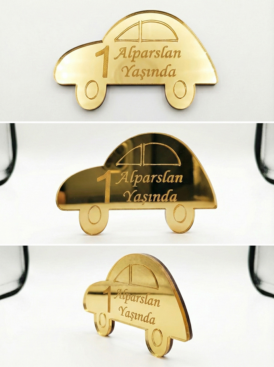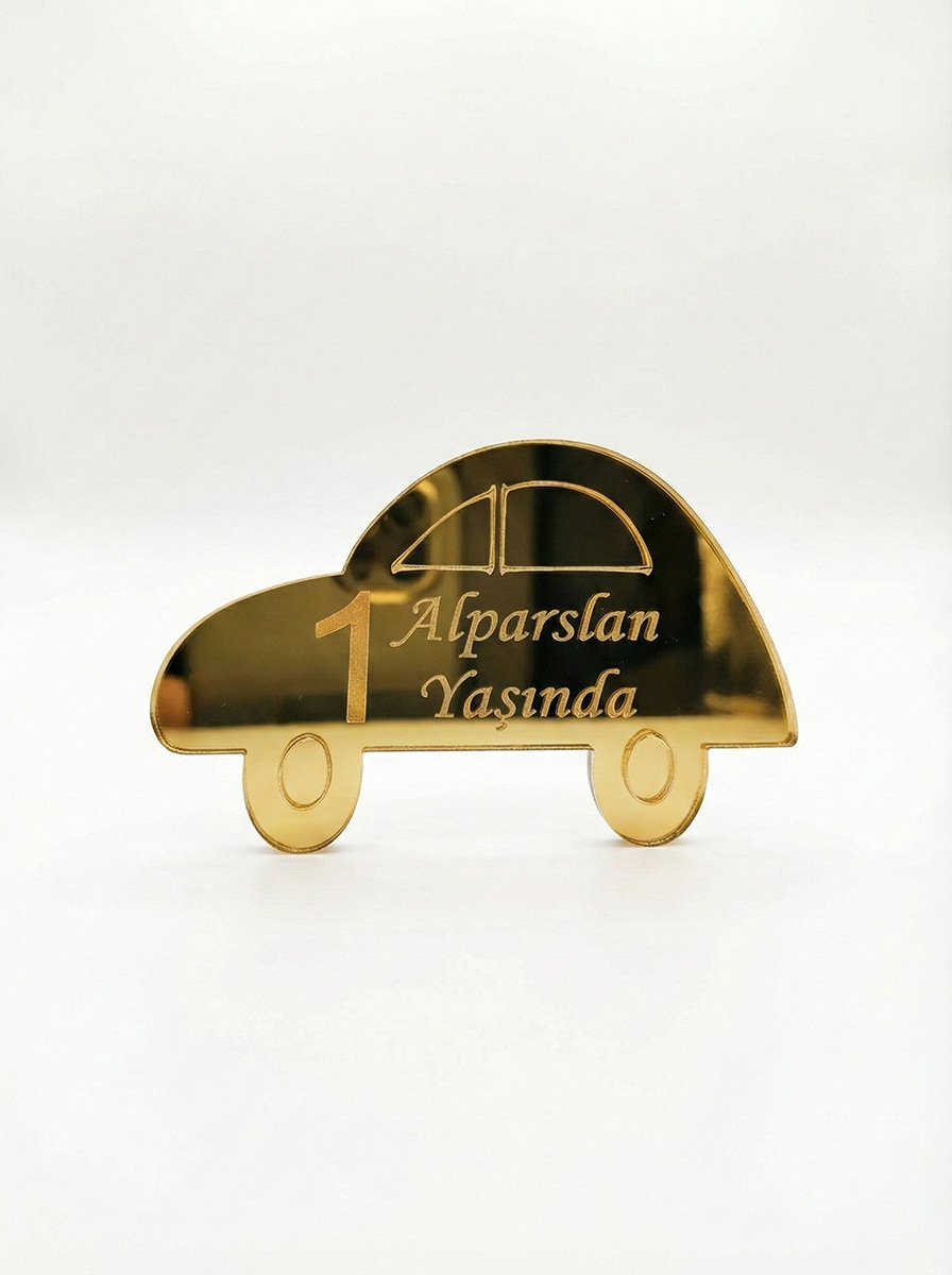 Tahtagurusu Kişiye Özel Tasarım Araba Figürlü Altın Ayna (Gold) Pleksi Magnet (1 Yaş Hatırası)